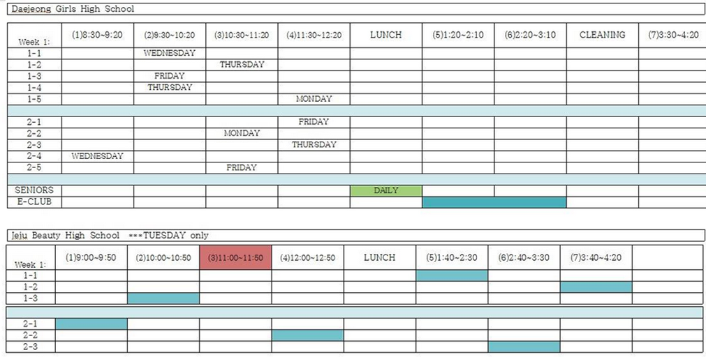 I have friends that teach at a couple different schools in Daegu and they were kind enough to pass along their weekly schedules to me.