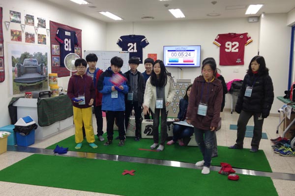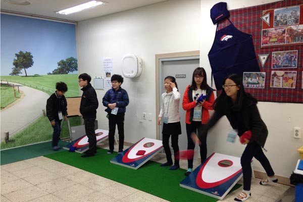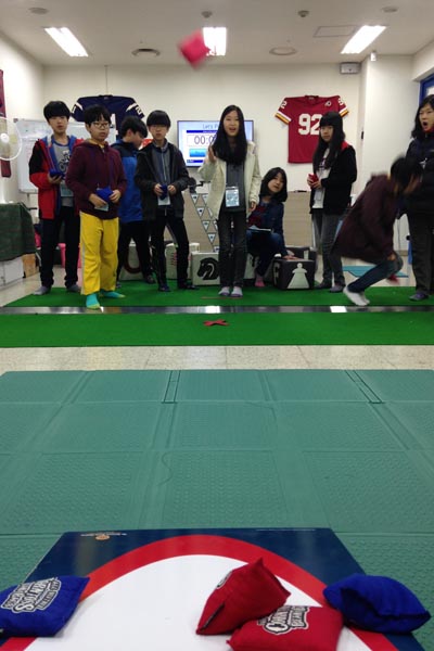 After the quiz is finished and we determine the winner, we watch a short video explaining the rules of cornhole. I then reiterate the rules in the simplest form possible and go over a couple additional classroom rules. Then the game begins…. I’ve tweaked this part of the lesson several times due to my room being small and the boards being very very weak (they are prone to breaking if the kids lean on them). My current method is to divide the kids in to two teams and pit them against eachother = most points wins.